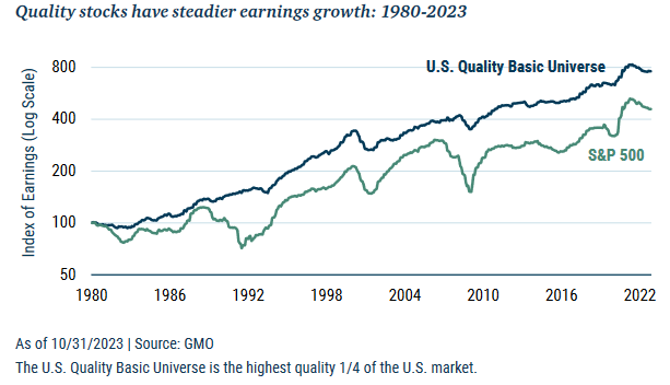 They illustrate the potential stability of the strategy by looking at the stability of the earnings of “quality” companies in comparison to the broader market.