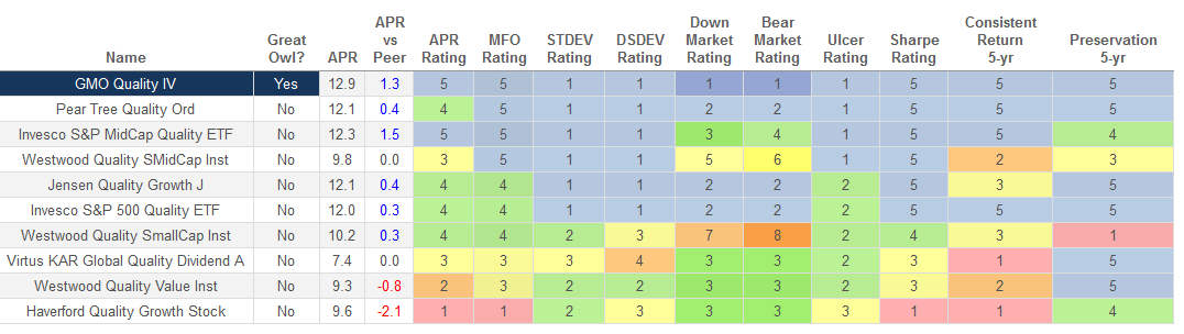 Dr. Hancock is the head of GMO’s Focus Equity team and has been with the strategy for 15 years, so we searched at MFO Premium for the 15-year performance of all equity funds with “Quality” in their name.