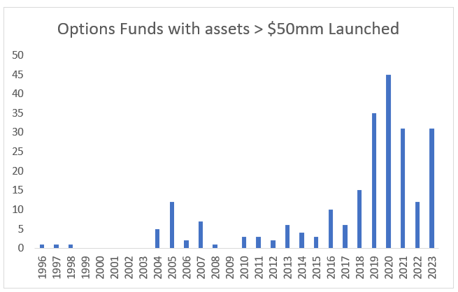 A search in Ycharts for funds with more than $50mm in Assets, categorized as Derivative Income or Options Trading yielded 238 funds with an asset base of $181 Billion. The median fee on these funds is about 0.85% per year or a total fee income of $1.2 Billion annually. The chart below splits these 238 funds by year of inception.