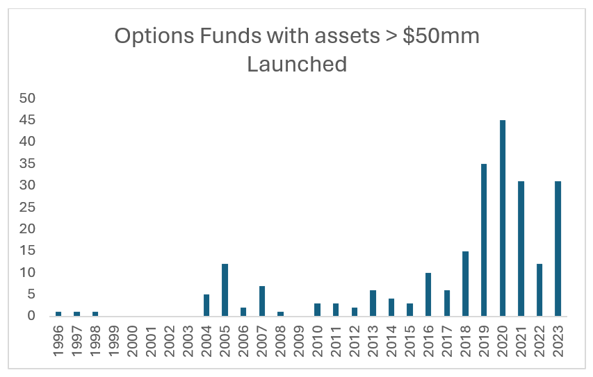As the chart below shows us, Options-based funds have picked up momentum starting in 2018. The Y-axis shows the number of Options funds with current assets greater than $50mm started in each year.