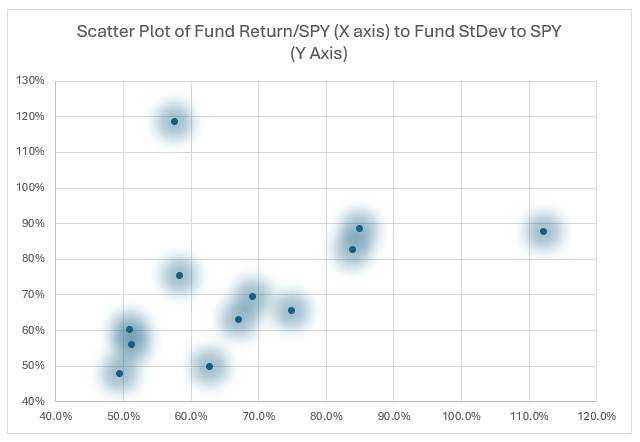 Combining the two tables above, I’ve plotted the Return % of these funds and the Std Dev of these funds compared to the SPY. In short, returns between 50-90% with a volatility of 50-90% of the SPY.