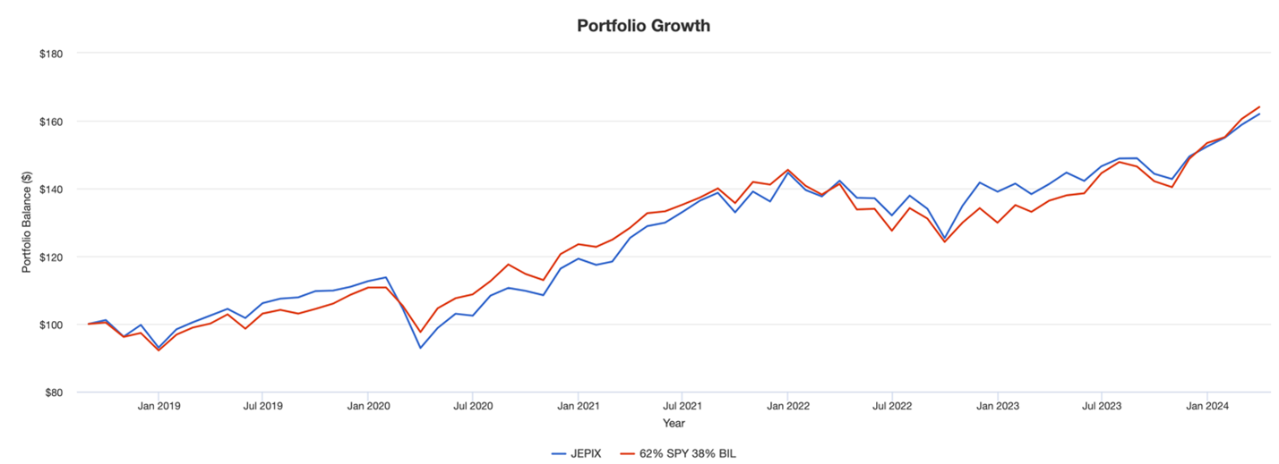 $100 invested in JEPIX and the 2-fund portfolio would be equal just about the same 5 ¼ years since launch.