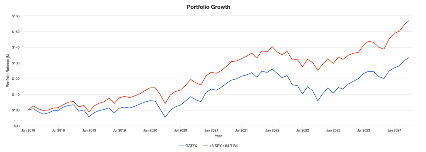 Step 2: Equivalent Portfolio = 46% SPY 54% T-Bill for period 2018 to 2024 March. Choose Annual Rebalancing in Portfolio Visualizer