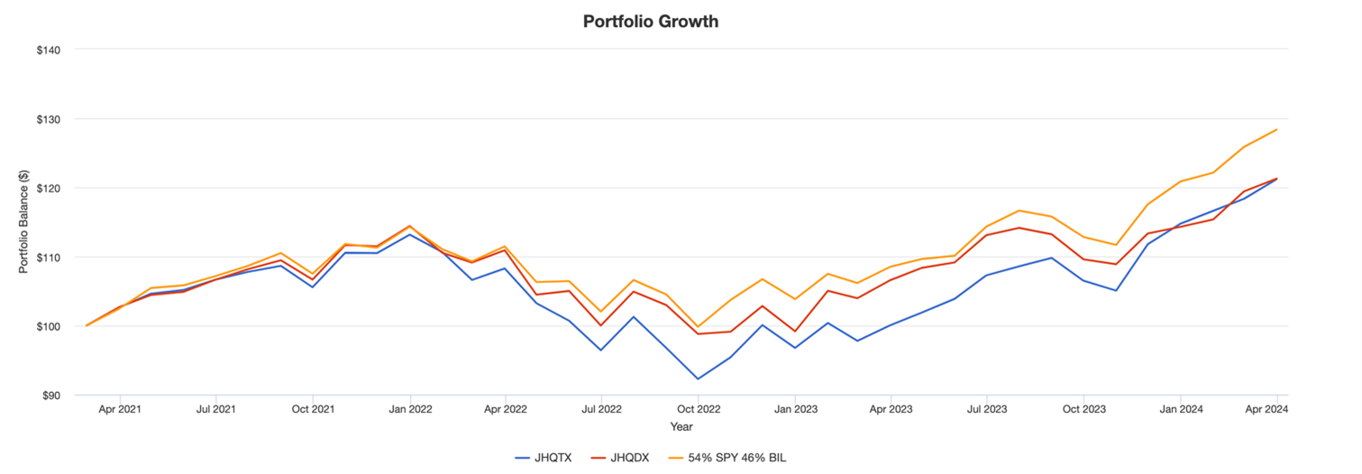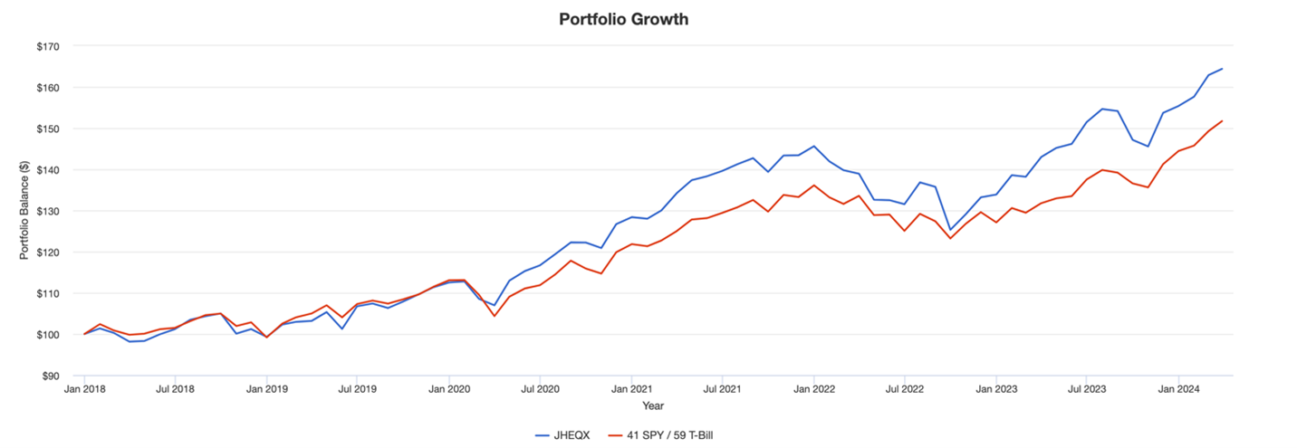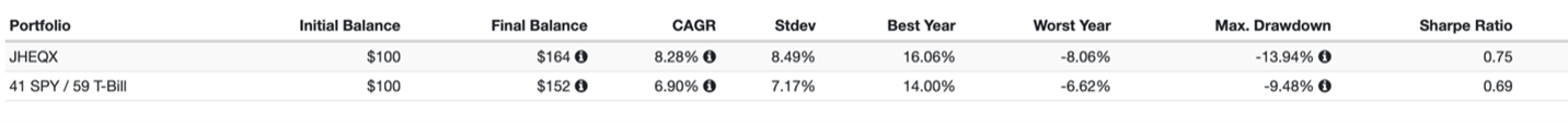 JHEQX had a higher annualized return of 1.4% over the last 7 years than its Replicating Portfolio, albeit also slightly higher standard deviation.