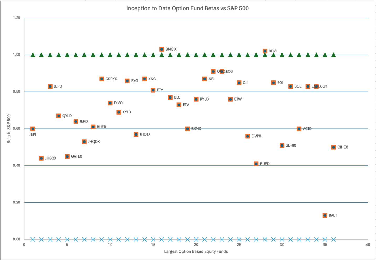 The Betas of most of these options funds (orange squares in the chart) are lower than 1 (the S&P 500 marked by the Green mountain range).