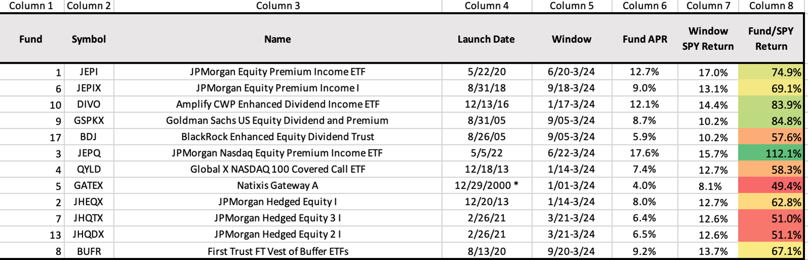 Column 8 compares the Fund’s annualized returns to the SPY’s to show what % of the SPY the fund earned.