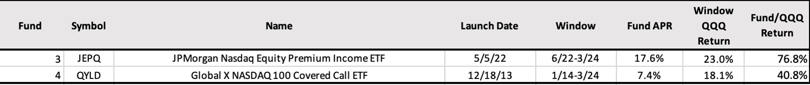 Comparing equity options funds to the S&P 500 (or the Nasdaq 100 where applicable) yields predictably disappointing total results.