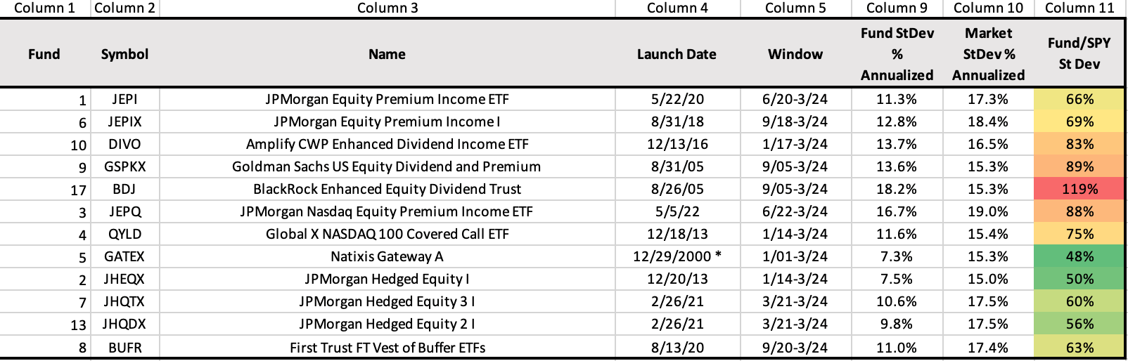 In fact, that’s very much the case. In the above table, calculated using Portfolio Visualized, I’ve highlighted our small group of funds, this time, in Columns 9 and 10, I’ve presented how volatile the fund has been during the window on an annualized basis versus the volatility of the Market. We’ve used % Annualized Standard Deviation as a measure. In Column 11, we show the St. Dev of the fund as a % of the SPY.