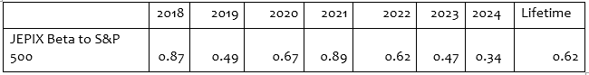 In the case of JEPIX, the story is that this Fund has a lifetime of 0.62 to the S&P 500 Index.