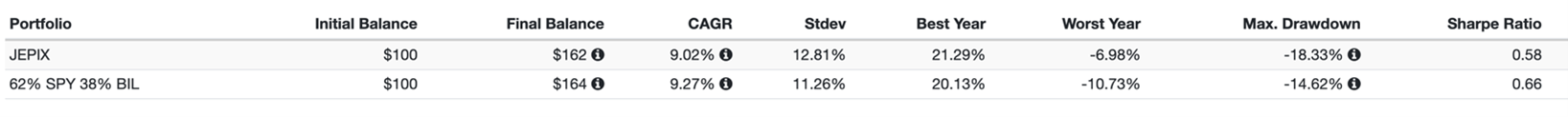 I ran that simple 2-fund portfolio in Portfolio Visualizer alongside JEPIX. Charts and statistics: