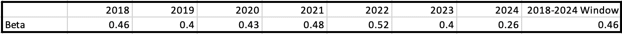 Let’s take just one fund, JEPIX, which is the Mutual Fund equivalent to JEPI. Together they hold a combined $39 Billion in assets. Using Portfolio Visualizer, I checked the Beta of JEPIX for each calendar year since its inception in Fall of 2018.