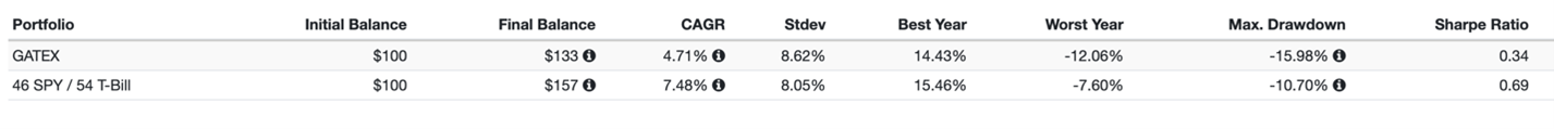 GATEX underperforms the Replicating Portfolio by 2.77% per year with a higher Standard Deviation than the Replication.
