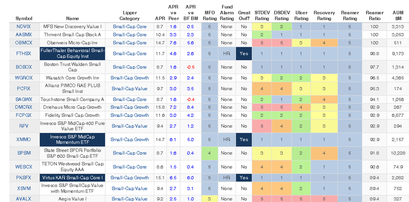 We asked the MFO Premium multiscreener to look at all small cap funds and ETFs and to identify those with the highest Reamer Ratio. That is, we looked for funds that would consistently win if you were willing to hold them for at least three years. All of the columns and color-coding rules are the same: happy investors have blue boxes!