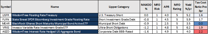 The list of funds in Bucket #1 is short because I used fund performance in 2022 and the COVID recession to push funds with high drawdowns into Bucket #2. Money market funds, certificates of deposit, and bond ladders should be considered a staple of a conservative bucket for emergencies and living expenses. The Tax Cost Ratio reflects the portion of the returns that will be lost due to taxes. The higher one’s tax brackets, the more applicable it becomes to invest in municipal bonds. For an investor wanting to minimize taxes, BlackRock iShares Short Maturity Municipal Bond Active ETF (MEAR) may be a great choice.