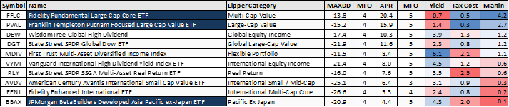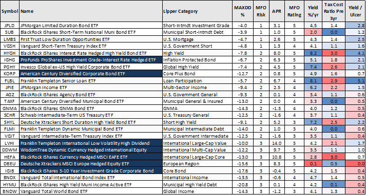 Several International Equity Funds make it into Bucket #2 because the valuations are lower and they have lower volatility. Franklin Templeton International Low Volatility High Dividend Index ETF (LVHI) stands out for having a high yield and Yield/Ulcer ratio along with high returns, but it is not particularly tax-efficient.