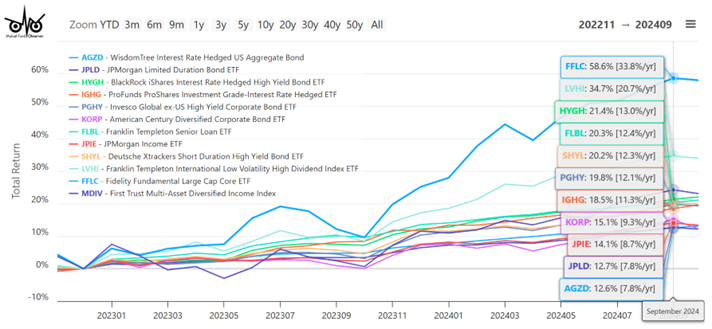 I have delayed making some small changes to my portfolio until next year in order to keep taxes lower in 2024. I plan to make normal withdrawals from riskier investments to lower my stock-to-bond ratio. Below is a chart of Total Return of some of the funds that I am tracking with the most interest.