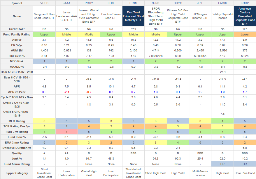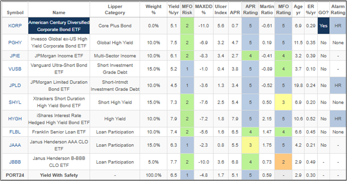 Table #2 is an example portfolio where I balanced yield and risk to my liking. The MFO Risk of the portfolio is “Very Conservative”. It would have returned 5.1% APR over the past 2.9 years with a current yield of 6.5% and a maximum drawdown of 4.8%. Note that it has 30% allocated to loan participation funds with 15% in the most conservative Janus Henderson AAA CLO ETF (JAAA). I have room in my own portfolio to increase yield with low risk.