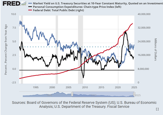 Figure #2: Ten Year Treasury Yield, Inflation, and National Debt.