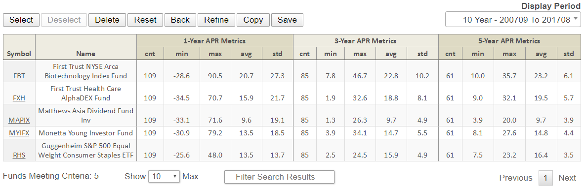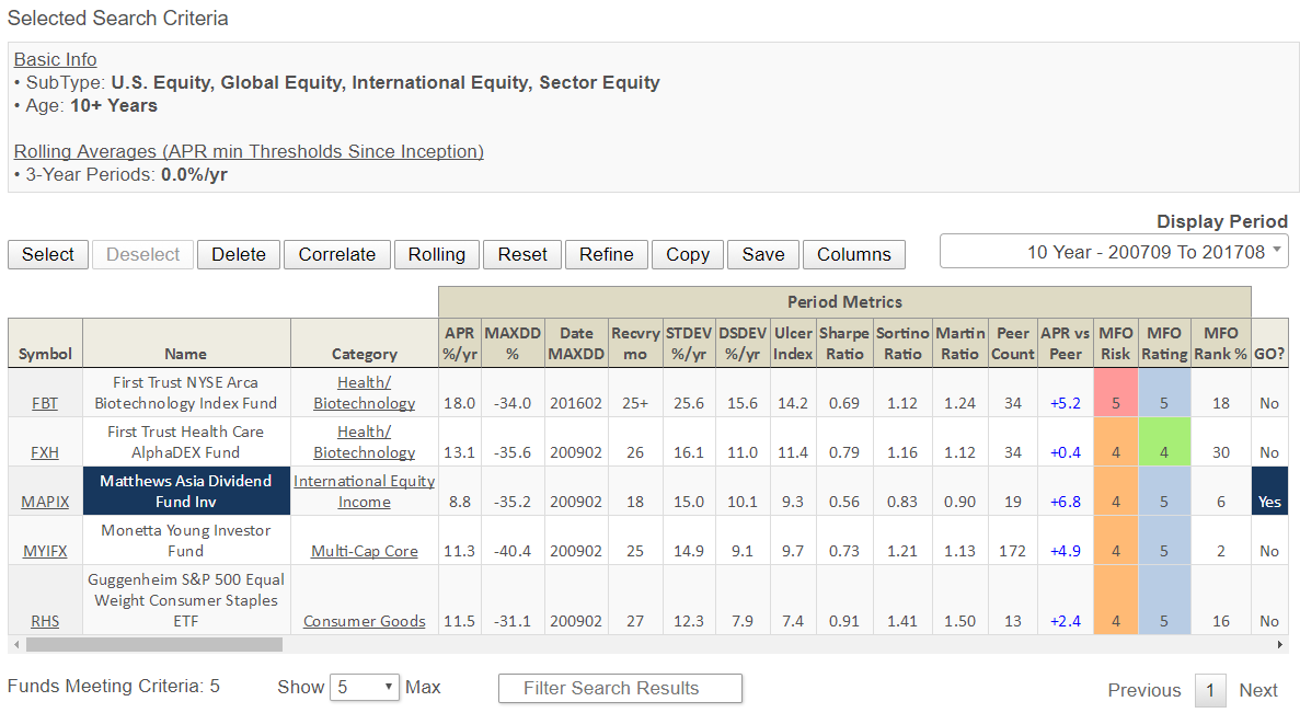 Using MultiSearch to screen for equity funds that are older than 10 years and never incurred a negative return over any 3 year period, only five of nearly 5,400 funds in our database pop-up: First Trust NYSE Arca Biotechnology Index Fund (FBT), First Trust Health Care AlphaDEX Fund (FXH), Matthews Asia Dividend Fund Inv (MAPIX), Monetta Young Investor Fund (MYIFX) and Guggenheim S&P 500 Equal Weight Consumer Staples ETF (RHS).