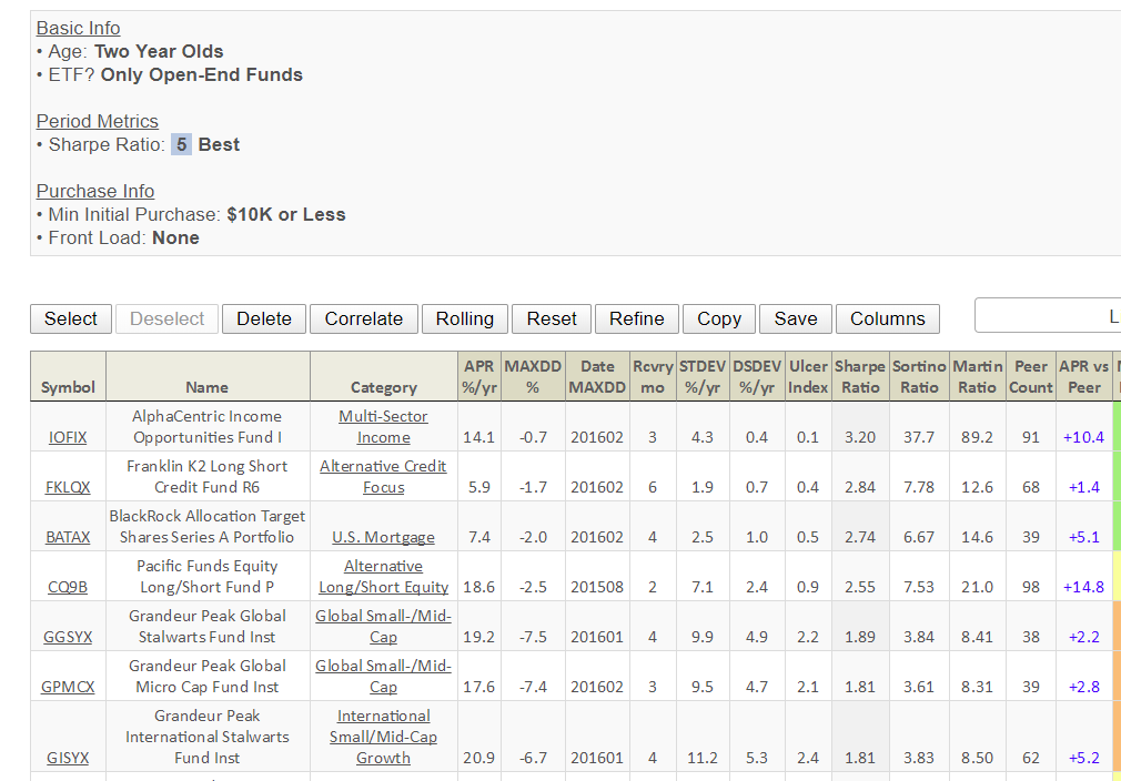 Two days later, the screener has an entirely new and useful capability. I’m vaguely awestruck by that sort of energy, passion and genius. So, like to find two year old open-end no-load funds with the highest Sharpe ratios that are open to retail investors? No problem!
