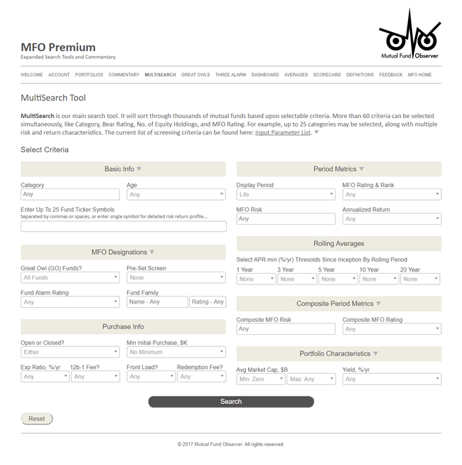 It has two features that most screeners lack, and both of them are Charles! Charles has been thinking about what’s really important for investors to know in order to make the best decisions for themselves and their families. As a result, (1) he’s built in tools – from uncommon risk measures to correlation matrices and rolling return screens – that give you information that’s meaningful. And (2) he revises the site almost monthly to accommodate your needs and interests. Literally: if you write with a concern, you get a prompt answer that actually comes from one or both of us. Quite frequently, you also get new or clarified options added to MFO Premium as a result.