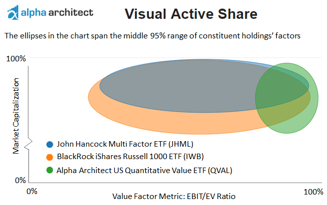 In the conference room, Wes is pulling up the Visual Active Share of John Hancock Multi Factor ETF (JHML). “What does this fact sheet say?” he asks skeptically. It states the fund will “emphasize smaller companies, lower valuations, and higher profitability.” But, in fact, “it does none of these things! And these guys are DFA, known for managing money of Nobel Prize winning economists!” The image below reveals the fund’s holdings shadow the Russell 1000 index in both capitalization and valuation, the latter based on the metric EBIT/EV or earnings before interest and taxes divided by enterprise value.