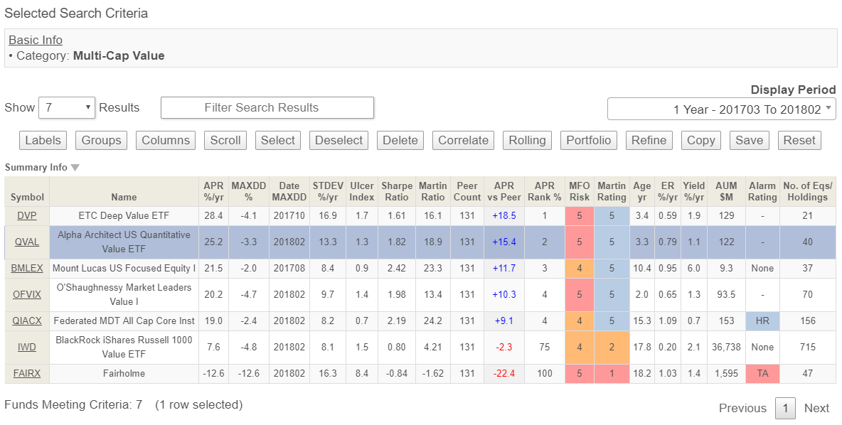 This past year through February, for example, QVAL has been exceptional. Of the 131 funds Lipper identifies in the MultiCap Value category, QVAL ranked No. 2 and it enjoyed top quintile risk-adjusted performance across multiple metrics, including Sharpe, Sortino and Martin ratios. Below, from the MFO Premium site, are the top five funds based on absolute return, along with the largest fund by AUM, BlackRock iShares Russell 1000 Value ETF (IWD), and the worst performing fund, Fairholme (FAIRX), which is actively managed by deep value investor Bruce Berkowitz … FAIRX’s 13.2% annualized 10-year return through December 2009 earned him Morningstar’s Fund Manager of the Decade award for domestic equity (click table to enlarge).