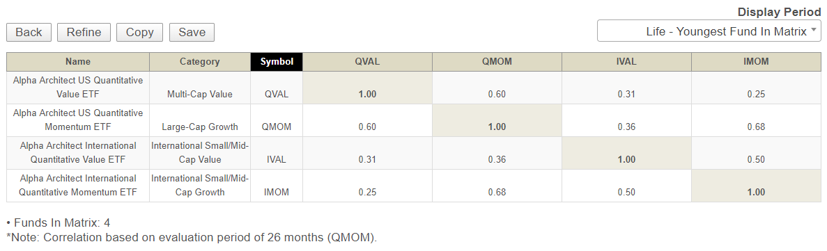 The correlation matrix of R values for the four underlining funds in VMOT shows rather uncorrelated behaviors, which I would expect and bodes well for the fund of funds diversification (click table to enlarge):