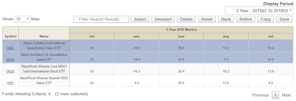 Finally, below is the 1-year rolling average performance of QVAL and IVAL over the past 3 years, along with IWD and BlackRock iShares Core MSCI Total International Stock ETF (IXUS) for comparison. There are 25 1-year rolling periods and the table shows the minimum, maximum, average, and standard deviation in absolute annualized return percentage. Despite some healthy drawdown, both funds have enjoyed even healthier upside, but you must be able to handle substantially higher year-to-year variation than the market (click table to enlarge).