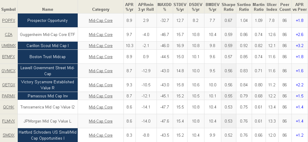 That philosophy reflects an approach similar to T. Rowe Price’s, and the results for Prospector have been outstanding. MFO does not measure success in terms of returns, but only in terms of risk-adjusted returns. Because Prospector invests in stocks of all market caps, and stocks that are characterized as both “growth” and “value,” it gets classified as a mid-cap blend fund (Morningstar) or a mid-cap core fund (Lipper). While not all mid-cap core/blend funds have a go-anywhere portfolio, many such as Prospector do, which makes them particular apt core holdings.