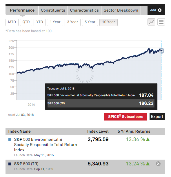ESG-screened indexes slightly outperform their unscreened versions. Here, for example, is a decade-long comparison of the S&P 500 and its ESG-screened sub-set.