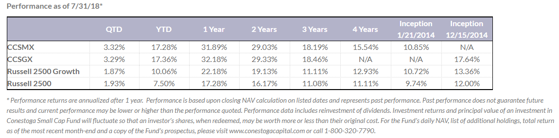 CCSMX is an extension of the firm’s capabilities in the small cap (CCALX/CCASX) space where it can leverage its knowledge. As the market capitalizations of smaller companies continued to drift higher and graduate into the mid cap space, the managers knew many of the names after covering them for so long as small caps. On July 1, 2018, Conestoga partially closed the small cap fund.