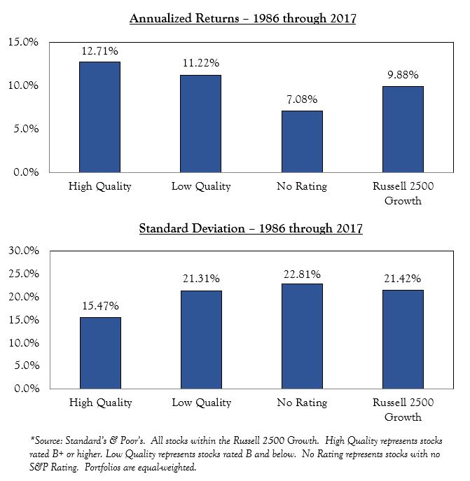 Regarding high-quality small/mid cap stocks, Conestoga has hired Standard & Poor’s (S&P) to conduct an annual study of the performance and volatility of high vs. low quality stocks for the time period of 1986 – 2017 for the Russell 2000 Growth and Russell 2500 Growth Indices. These studies confirm that higher quality names have outperformed lower quality names and have done so with much lower levels of volatility.