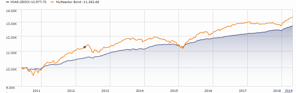 To get an idea of its steadiness, here’s a chart of ZEOIX against Morningstar’s equivalent to the Multi-Sector Income group: