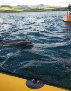 June 4, 5: in Dingle. A beautiful harbor town, home to outstanding ice cream and the best chowder either of us has ever had. The two highlights were (1) starting the Slea Head Drive – a scenic bit of cliffside road that appears precisely one foot wider than the tour buses that are coming directly at you – and (2) a sea safari, seated on pommels and riding a speedboat for four hours out of the harbor, along the coast and around the Blasket Islands. We were accompanied for much of the way by a pod of 50 dolphins, which was intensely cool.