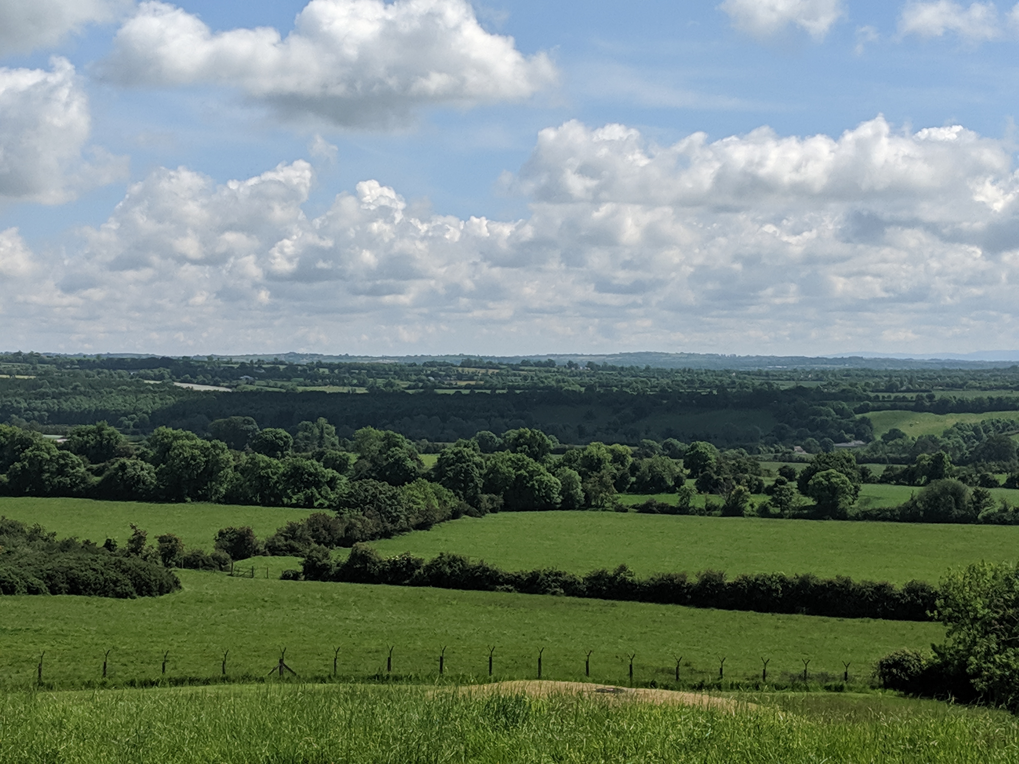 June 10: drove eastward to Brú na Bóinne, roughly “Mansion on the River Boyne.” There are three huge tombs (Knowth, Dowth and Newgrange) at Brú na Bóinne that predate the Pyramids by a millennium and Stonehenge by more. They’re interspersed with 35 smaller tombs and other Neolithic structures.