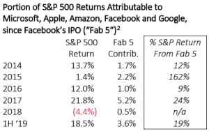 It could happen. But for those with patience, I refer you to Horizon Kinetics’ excellent Q2 Market Commentary. They point out that of the S&P 500’s annualized 10 year return of 14.7% to 6/30/2019, 10% of it came from just five companies – Microsoft, Apple, Amazon, Facebook, and Google. The question they raise is, how much more can the internet grow before saturation is reached and growth rates slow (which means share prices must fall)? The last point I will leave you with, but encourage you to read the entire piece, is that the way indices such as the S&P 500 are constructed leads to them ultimately becoming undiversified. This is because a tiny number of firms become quite successful and dominate their respective index. The under diversification becomes even more of a problem when you account for the misclassification of companies into different industries. After adjustments, they are often very correlated. Indeed, by Horizon’s estimate, the Internet Beneficiary weighting of the S&P 500 is 31.63%.
