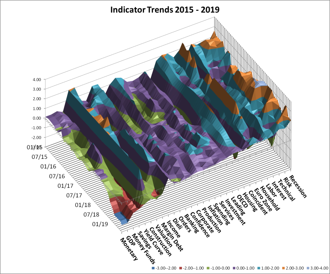 Chart #4 is my detailed view of the Investment Environment. Some indicators raise warning flags and others signal strength. The weakest indicators are to the left and the strongest are to the right. Recession and Financial Risk are currently low, while Monetary Policy, an economy near capacity, “flight to safety”, and yield curve are signaling caution is warranted.