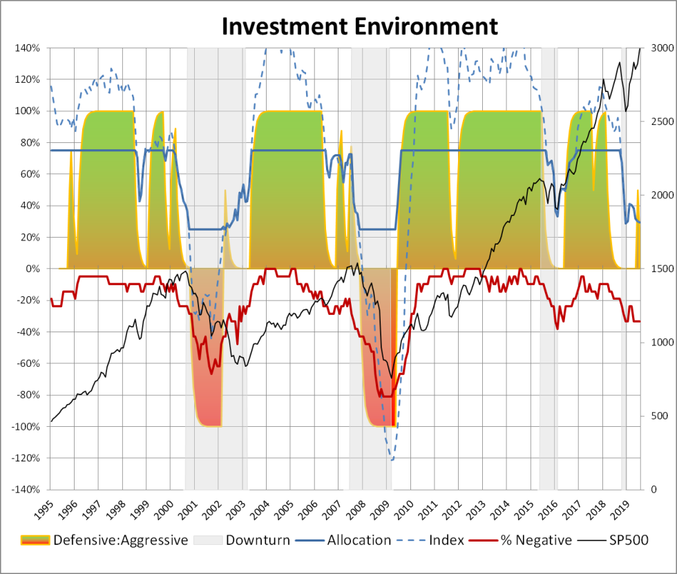 Chart #5 shows the summary view of the investment environment. The dark blue line is my target allocation to stocks following Benjamin Graham’s guidelines of never having less than 25% allocated to stocks, nor more than 75%. It currently suggests an allocation of 30% to equities. Why? Monetary policy has been three years of raising the federal funds rate and quantitative tightening, the economy is near capacity, institutional and retail investors are building up cash reserves, bonds are out-performing stocks, the yield curve has inverted, construction spending is in the doldrums, valuations are moderately high, orders are declining, and so on. The red line is the percent of indicators that are negative. The weakness is broad and expanding.
