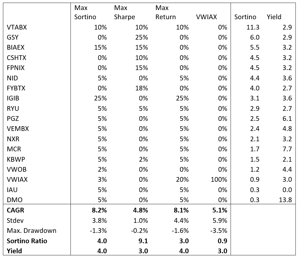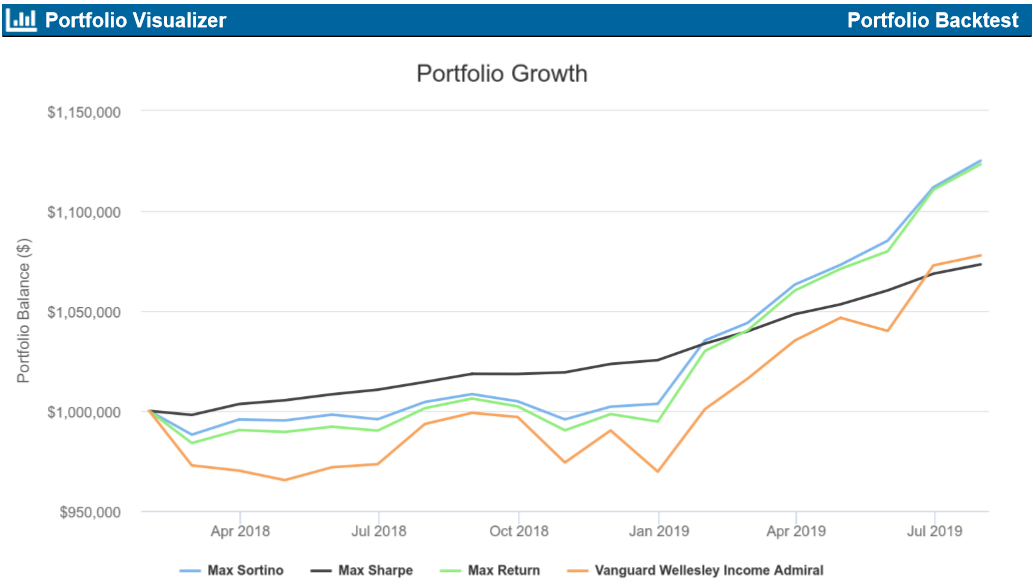 Use of Portfolio Visualizer is currently free. It optimizes allocations to funds. I used three options: 1) Maximize Sortino Ratio (risk adjusted return) for 7% return, 2) Maximize Sharpe Ratio at 5% Volatility, and 3) Maximize Sharpe Ratio (least volatility), and compare them to the Vanguard Wellesley Income Fund (VWIAX) for the past 18 months. These are not recommended portfolios but are representative of how funds might do in a portfolio. None of the Model Portfolios have 25% equity which is my minimum target allocation.