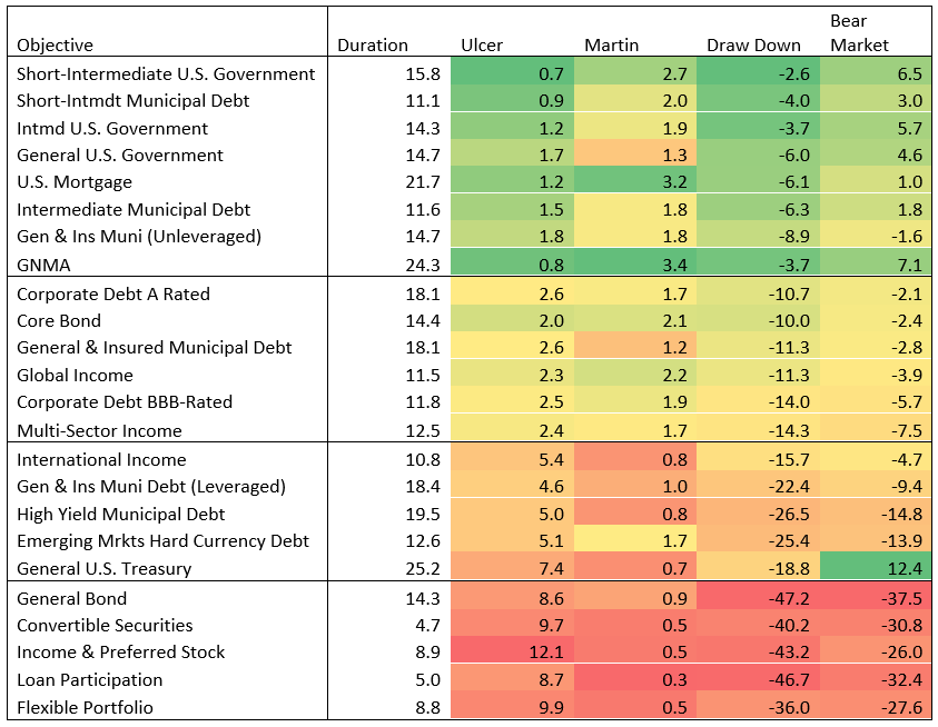 What about the Vanguard Long Term Treasury Fund (VUSTX)? It has returned 22% over the past 12 months! Table #5 was created from 280 funds with 20 year histories and contains the performance of long term bond Objectives. The Bear Market column is an average for the 2000 and 2007 Bear Markets. The top section is lowest risk (Ulcer Index) with highest risk adjusted returns (Martin Ratio). The second section is low risk, moderate risk adjusted performance. The third section is still low risk when compared to the S&P 500 over the past 20 years with an Ulcer Index of 17.6. Even the final section has Ulcer Index values about half of the S&P 500, but high drawdowns. The Vanguard Long-Term Treasury Fund (VUSTX) had a maximum drawdown of 19% over the past 20 years. The return over the past 3 months has been 15%. While I have shifted to conservative investments, I am not convinced that a recession is imminent. My base case is that interest rates continue to fall. My preference is for less volatile intermediate bonds. It does make sense to own long term bonds if one believes that interest rates are going down for an extended time or want a hedge against stock market volatility. My preference is to own funds in the top two sections.