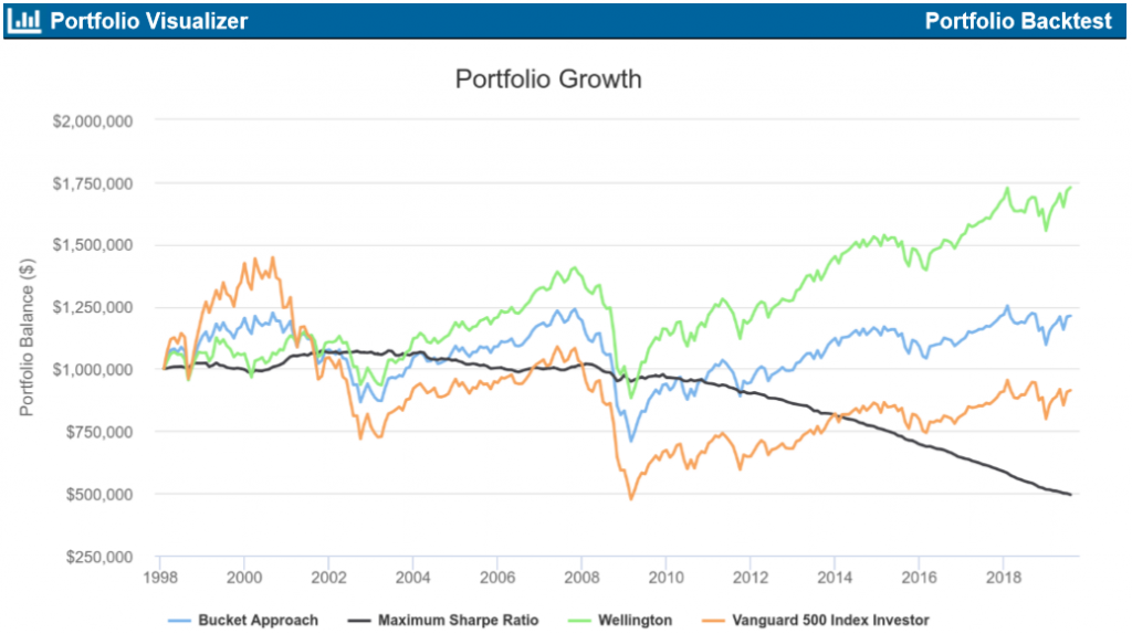 Chart #3 shows the Bucket Approach described in Table 3, the Maximum Sharpe Ratio low volatility portfolio (85% Vanguard Short-Term Federal, 15% Wellington), 100% Wellington and 100% S&P 500 portfolio. The assumptions are that $4,000 is withdrawn monthly starting in 1998 and adjusting for inflation. I own VASIX, VWIAX, and VWELX and will through the next recession, although allocations will change over time.