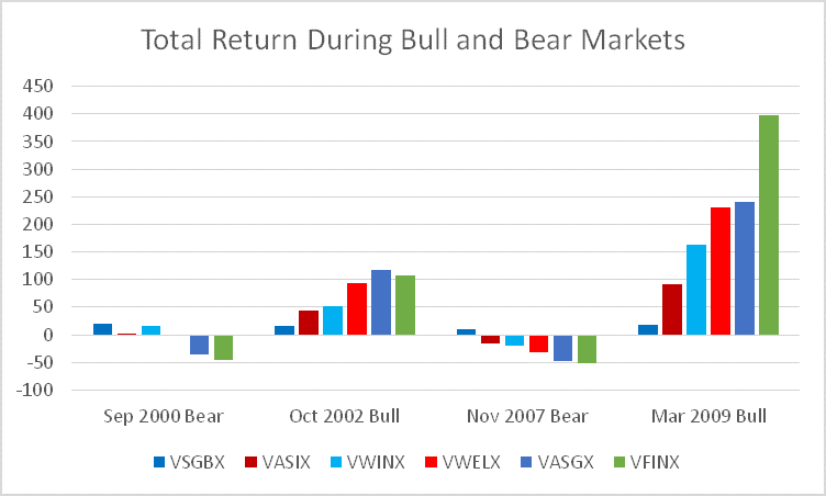 Table #1 tells a different story. Over the past 20 years, the Vanguard Wellesley Income Fund (VWINX) and Vanguard Wellington (VWELX) have both out-performed the S&P 500 including dividends, with less volatility and lower drawdowns. The reason for this is that if a fund loses 50% during a bear market, it must double to recuperate the losses. It took the S&P 500 five years to recover from the 2007 bear market.