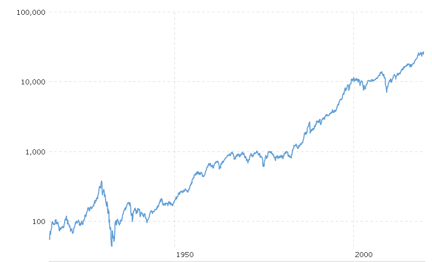 100 years in the US stock market. Source: https://www.macrotrends.net/1319/dow-jones-100-year-historical-chart