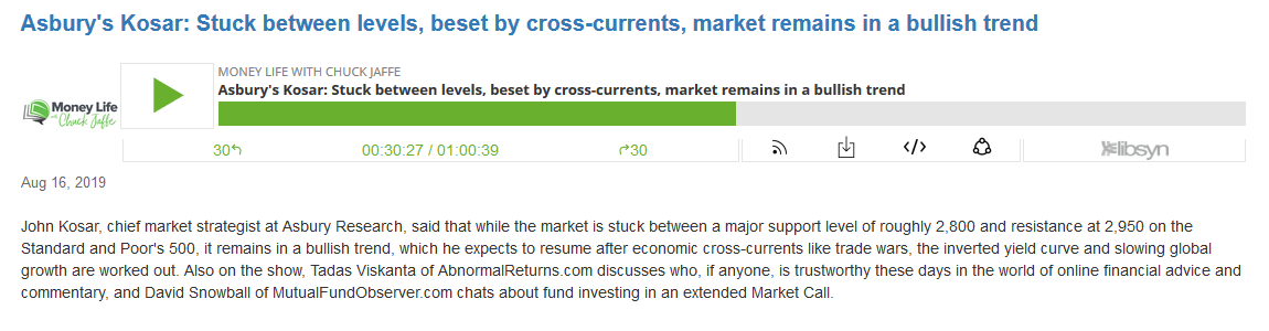 Three better uses of your time while you’re on Chuck’s site. (1) Listen to Tadas Viskanta, who’s the star in the segment just before mine. (2) Skip ten days ahead to Andrew Foster, “Emerging markets are cheap, but growth there is slowing,” August 26, 2019. Andrew is on the short list of “smartest, most thoughtful guys I’ve ever met.” (3) Grab the picture of Chuck on his homepage and try our new “Caption Chuck” contest.