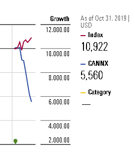 Cannabis Growth Fund (CANNX) is doing away with its institutional share class. The current institutional shares will be converted into investor class shares on November 14, 2019. As part of that conversion, the expense ratio on the investor shares will be reduced to the level now assessed on institutional shareholders: 1.10%. Not to offer any commentary on the change, but the fund has $1.8 million and its performance since inception looks like this: