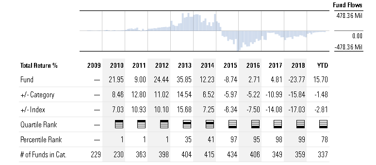 Answer: the five fat years have been followed by the five lean years. Putnam had above-average to top-tier performance through 2014 and money poured in. Starting five years ago, in 2015, they’ve had absolutely bottom-tier performance and money poured out. Here’s the snapshot from Morningstar: