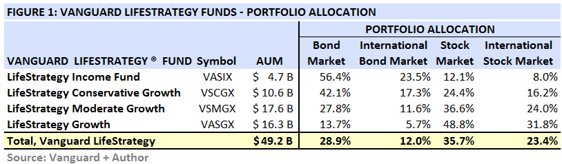 The four LifeStrategy funds invest in the Investor Share classes of each of the following four index funds – VTBIX (US Bonds), VTIBX (International Bonds), VTSMX (US Stocks), and VGSTX (International Stocks). FIGURE 2, below, summarizes the symbols used to access these funds, as well as their respective expense ratios and total assets under management (or AUM).