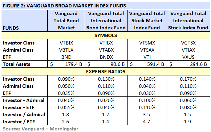 The expense ratios of the four Investor class funds range from 17 bps for the Total International Stock Market Index Fund, to 9 bps for the Total Bond Market Index Fund.