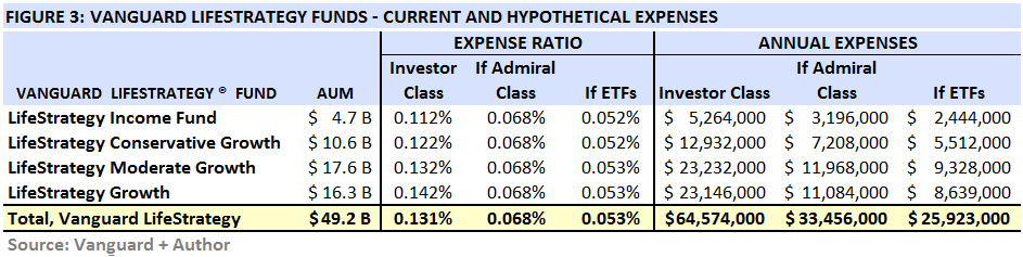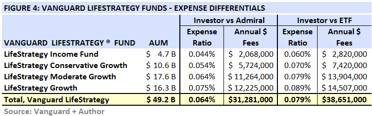 For the total $49.2 billion currently invested in LifeStrategy Funds, their costs might drop by almost half, from $64.6 million per year to $33.2 million per year — see FIGURE 3. These differentials are summarized in FIGURE 4, below.